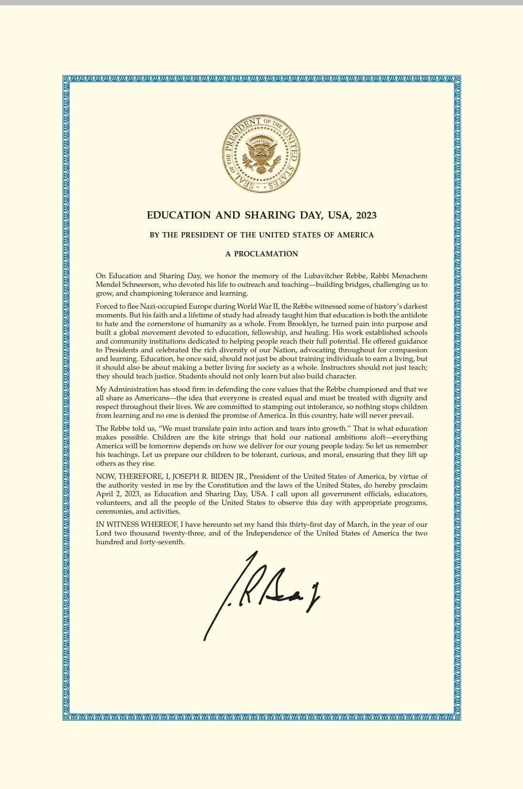 Education Day was designated by a congressional resolution with bi-partisan support in 1978, as a national day of reflection, inspired by the teachings and example of a man who has had the most profound impact on my life. Rabbi Menachem Mendel Schneerson was the most influential Jewish leader in modern history, known to millions worldwide as “the Rebbe'' (Yiddish for teacher). He led the Chabad-Lubavitch global Jewish movement from 1950 until his passing in 1994. In the decades since, his ideas continue to inspire humanity.
